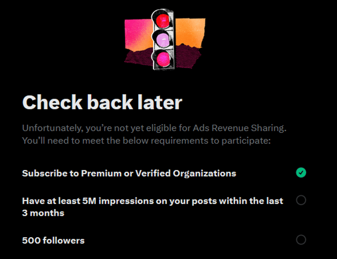 I went to Twitter’s Monetization section and received a firm “Not yet”