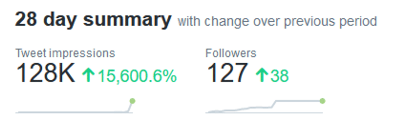 Impressions are through the roof (15,600% is some crypto level gains). But that’s because I started from close to zero. We should see this number getting more reasonable and stable over time.
