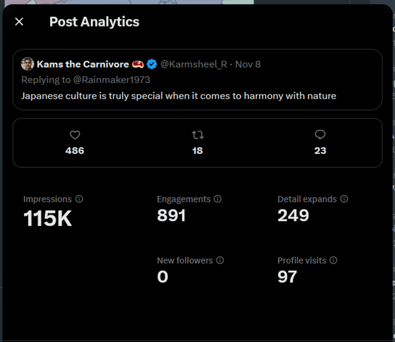 Deeper analytics show that my reply garnered me 97 profile visits. Based on that, I have definitely converted about 5-7 of them into new followers. It seems that stat is broken on the dashboard above.